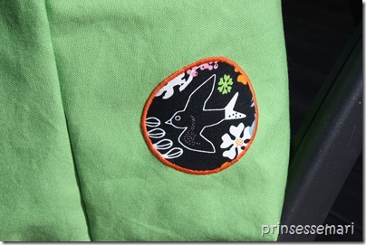 Dekoren er en fugl fra fórstoffet og et blad som jeg har sydd etter konturene på et blad i fóret.